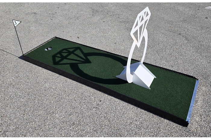 Put a ring on it with the Wedding Ring Mini Golf Obstacle, designed to resemble a sparkling engagement ring along the putting lane. Golfers must carefully guide their ball through or around the ring to reach the hole. This eye-catching piece symbolizes the commitment being celebrated and adds a stylish touch to the course. It’s a perfect feature for weddings, proposals, engagement parties, and anniversary events.