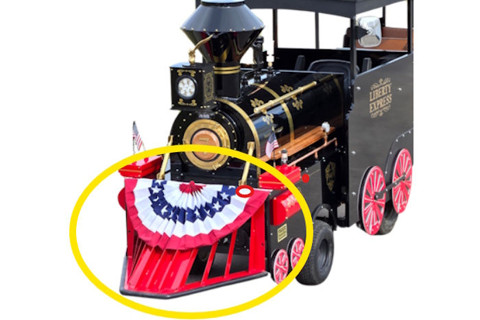 Add a bold, all-American flair to your trackless train rental with our Patriotic American Flag Bunting Add-On! Designed to instantly elevate the look of your train engine, this vibrant red, white, and blue bunting attaches neatly to the front, creating a festive and eye-catching centerpiece for any celebration.
