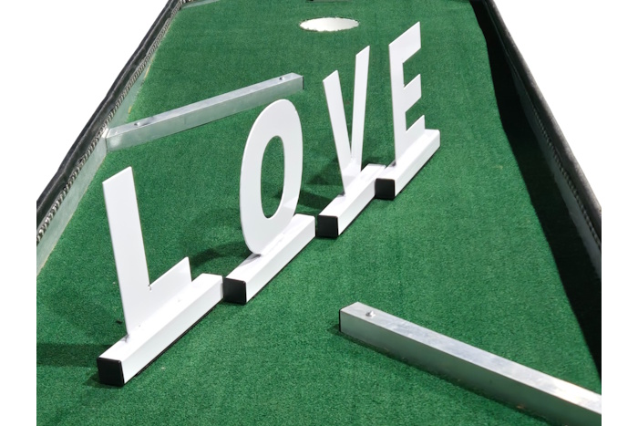 Add a romantic touch to your wedding event with the Love Mini Golf Wedding Obstacle. This elegant feature spells out “LOVE” across the putting lane, creating a fun challenge as players carefully aim their shot between the letters. It’s a beautiful photo-worthy detail that fits perfectly with wedding receptions, bridal showers, and engagement parties. Guests of all ages will enjoy putting their way through this charming symbol of love.
